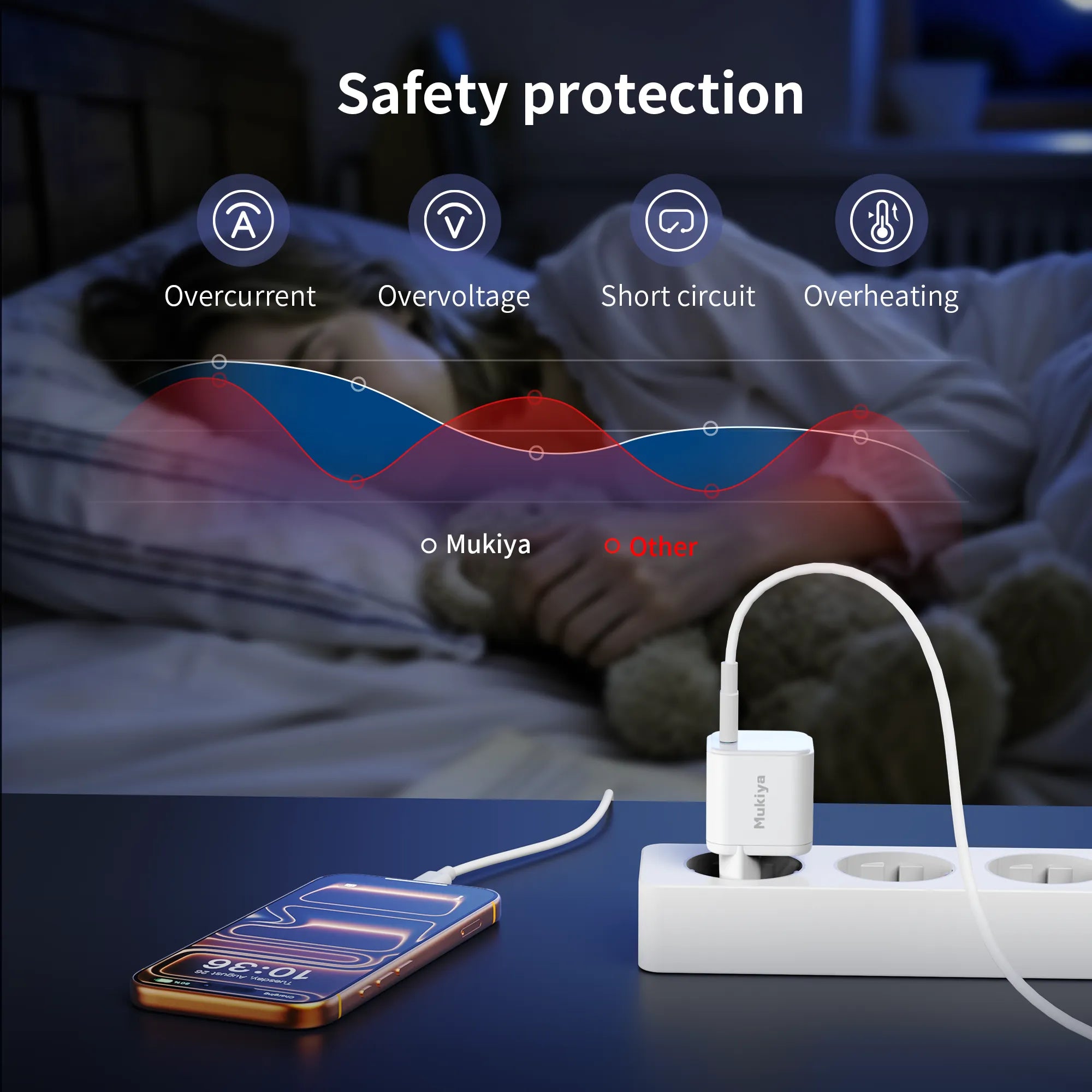 Real-time temperature monitoring: Mukiya stays cool (blue line), while cheap chargers overheat dangerously (red line)