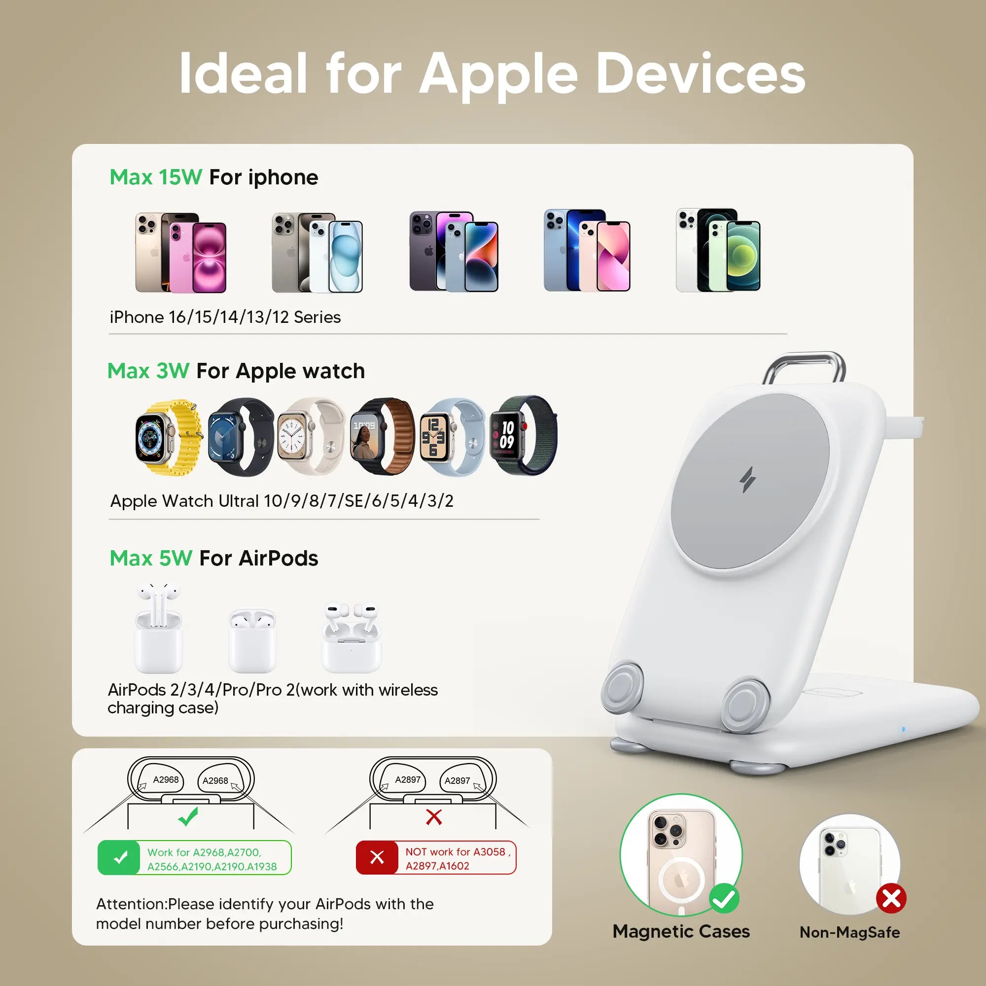 Supports simultaneous charging for iPhone and Apple Watch with magnetic alignment for secure connection.