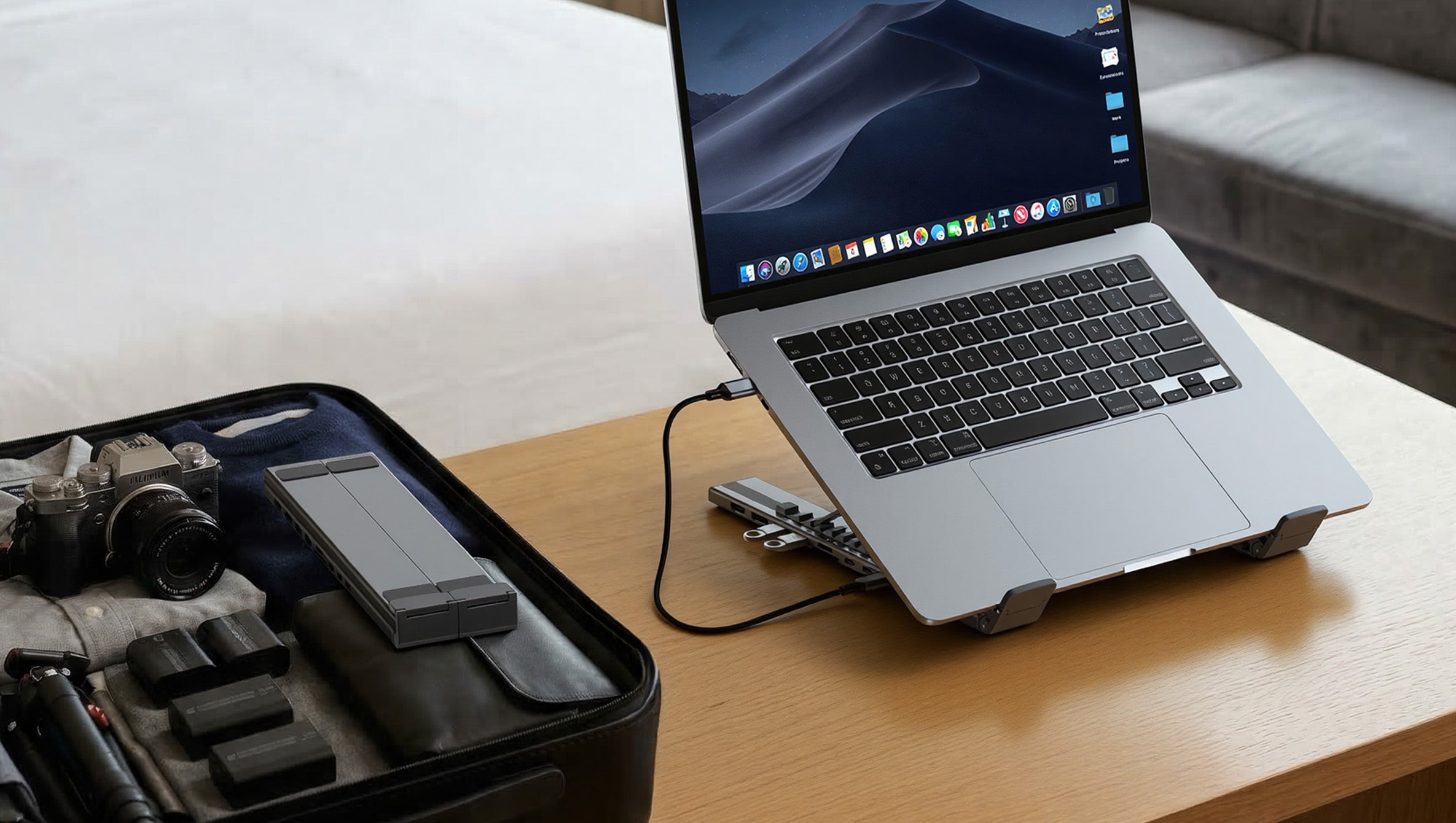 This setup supports external displays, full peripherals, and long work sessions — while keeping your workspace structured and distraction-free.